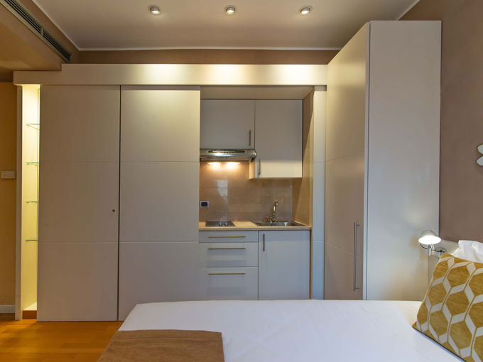 Cucinotto stile office super accessoriato, frigorifero e stoviglie vanno ad aggiungersi alle dotazioni base delle camere superior per garantire il massimo del comfort e dell' indipendenza.